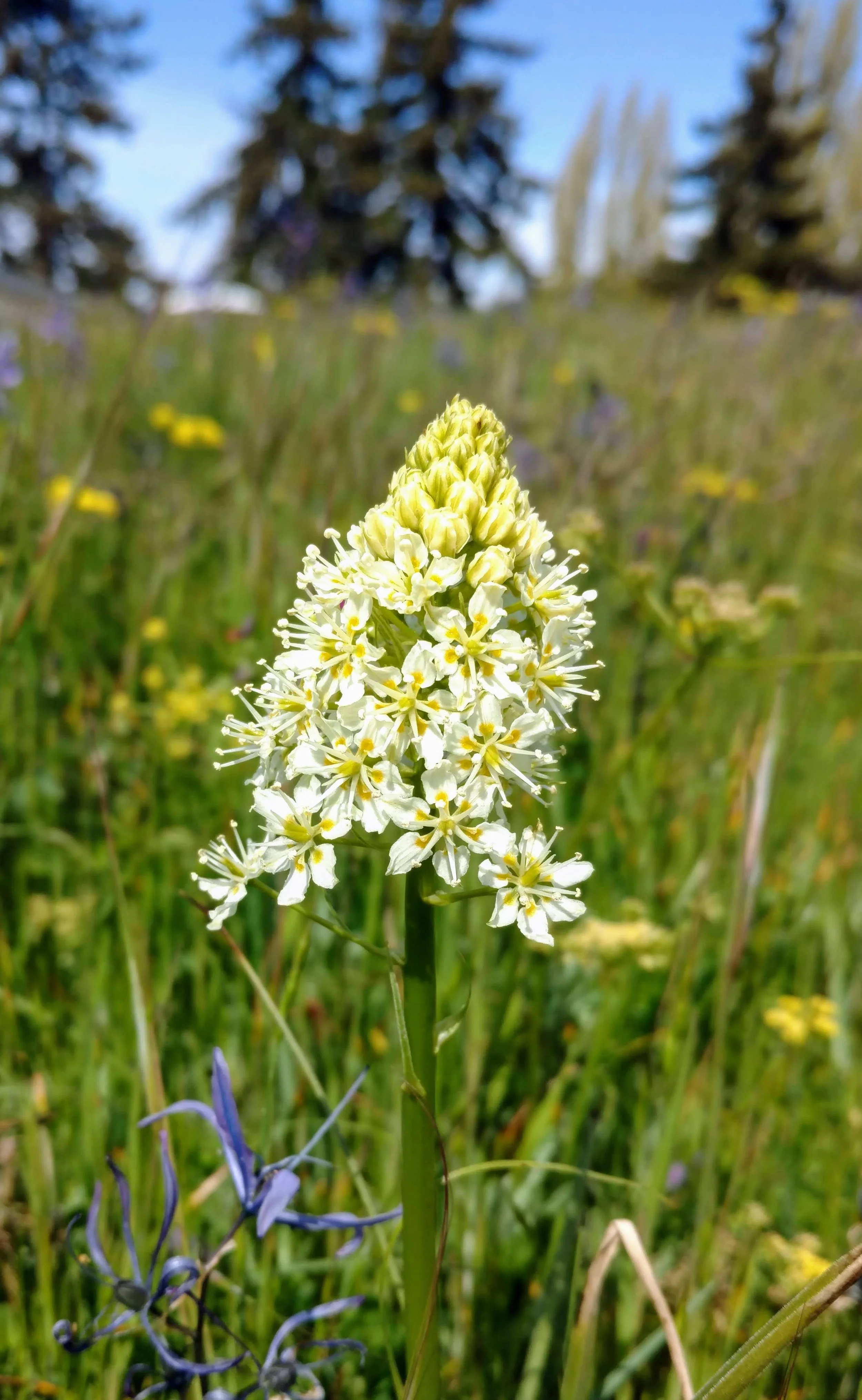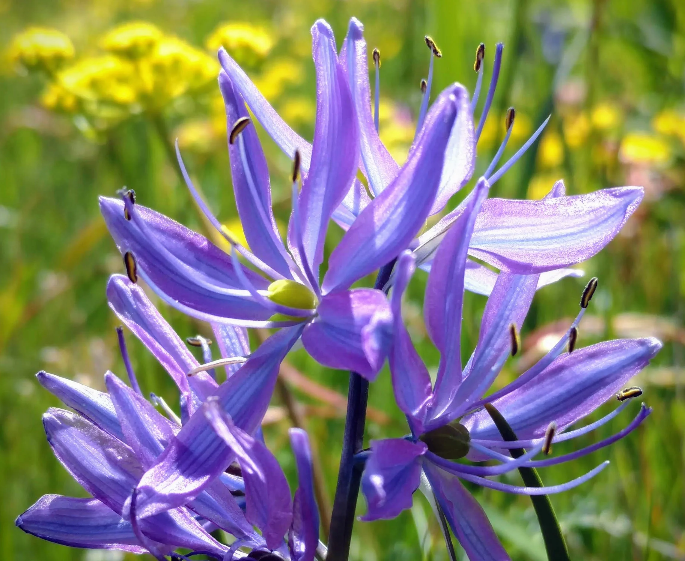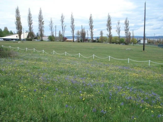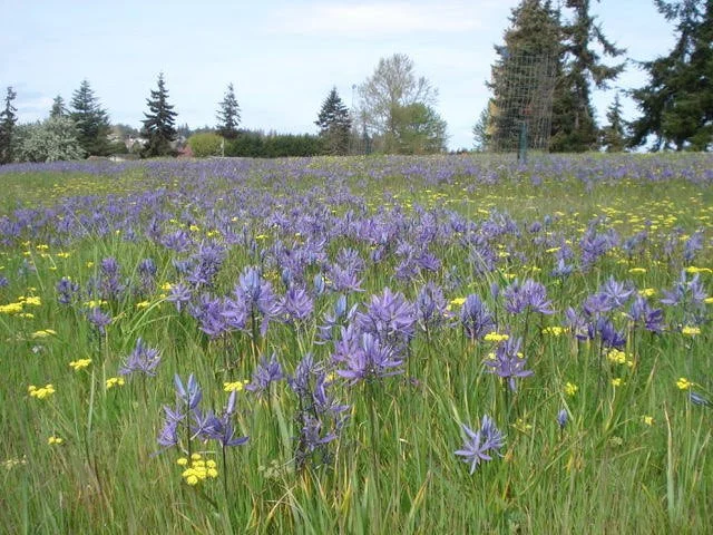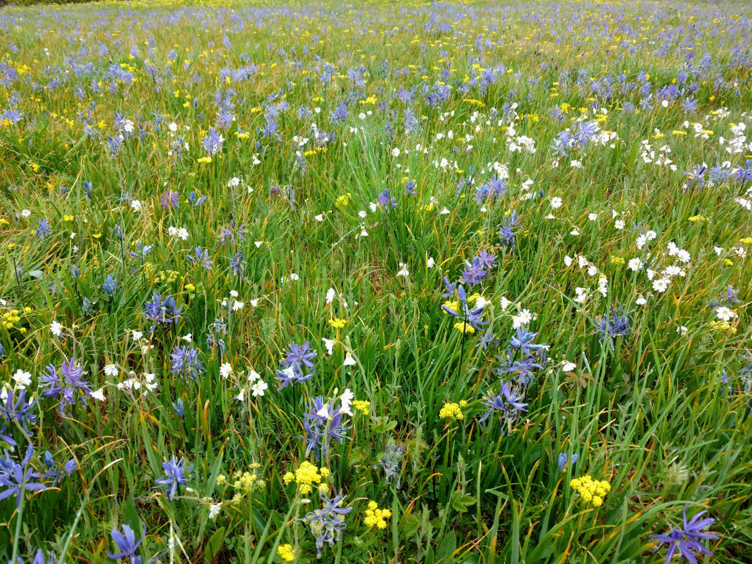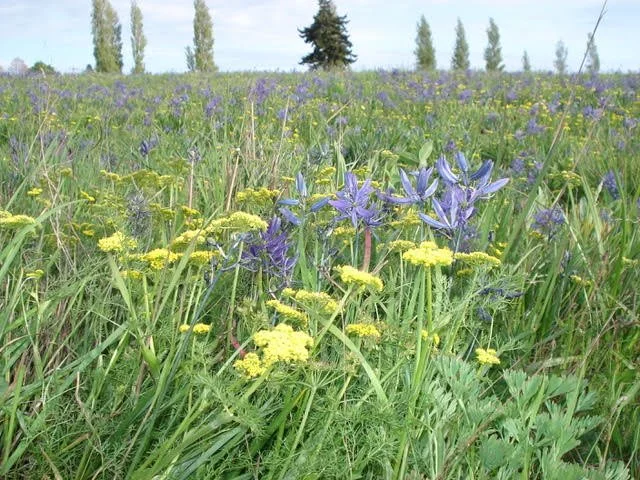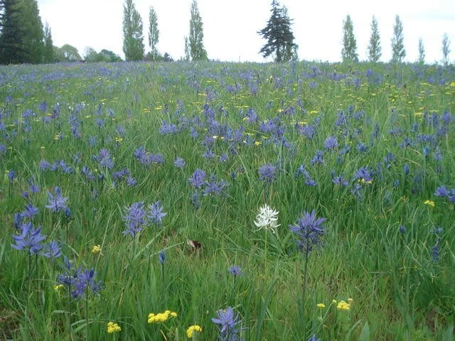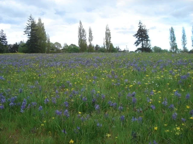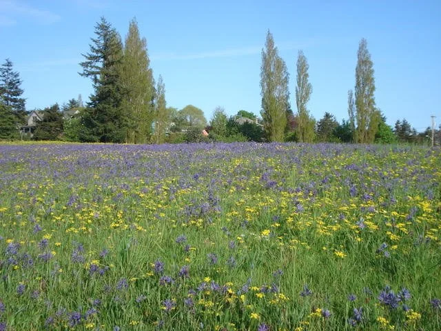 The botanical show begins each spring with the purplish blooms of Douglas' grass-widows (Olsynium douglasii) dotting the green grass, and then erupts into glorious blue camas (Camassia quamash). The stunning palette of blue camas is punctuated by white, yellow, and pink from buttercup (Ranunculus occidentalis), common lomatium (Lomatium utriculatum), old man's whiskers (Geum triflorum), and death camas (Toxicoscordion venenosum). In summer sunlight, dwarf goldenrod (Solidago simplex) and showy fleabane (Erigeron speciosus) shine bright, completing the Kah Tai color spectacle.